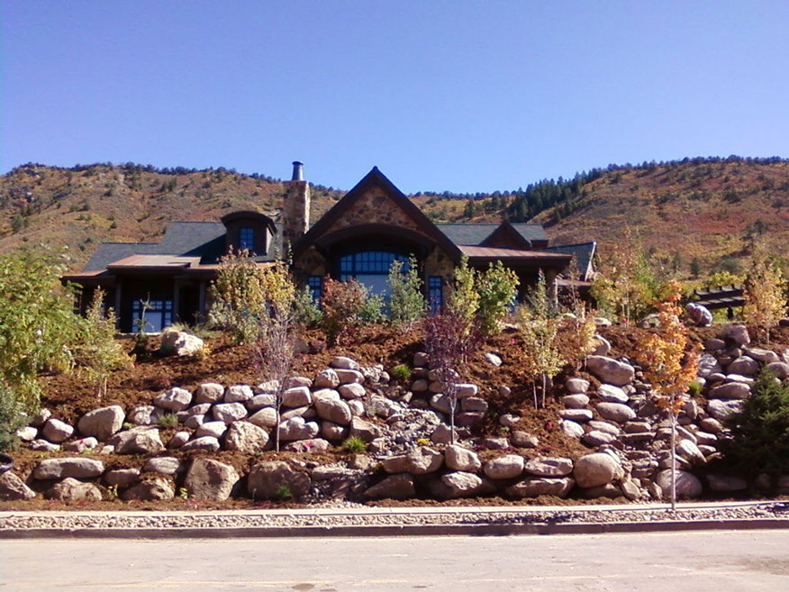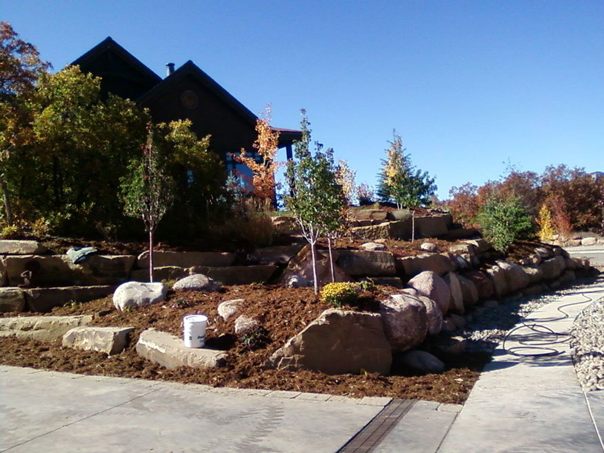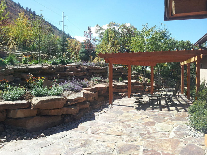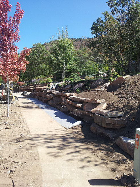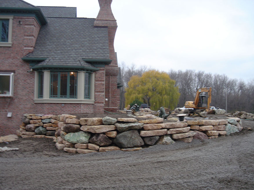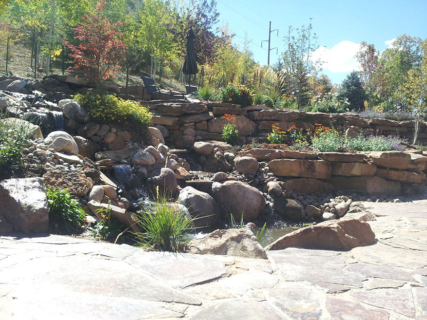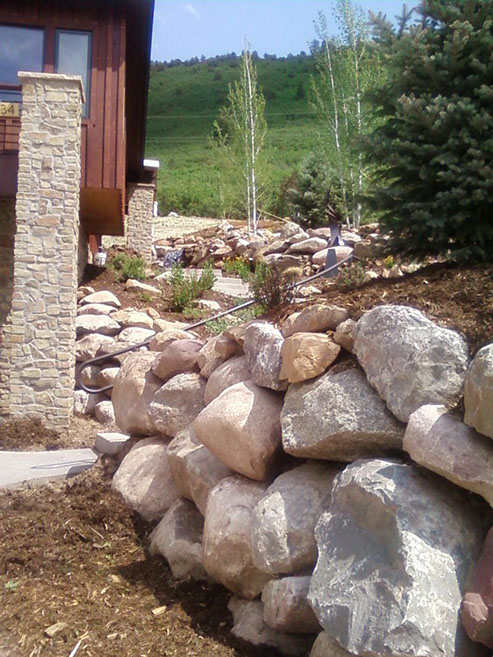 We build a variety of retaining walls using slab rock, limestone, montana grizzly, blue flagstone, slate, boulders or interlocking systems.